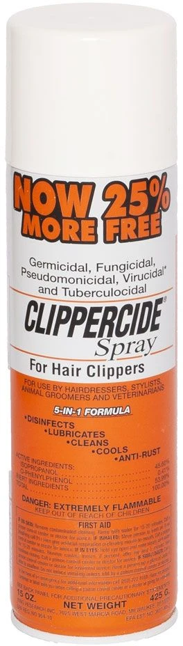 Clippercide Spray cleans, lubricates, and cools clipper blades. Effective against harmful bacteria and fungi and reduces friction for smoother running blades and prolongs clipper life.