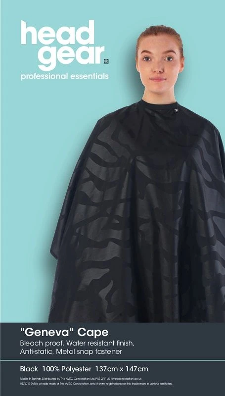 Head Gear Geneva Deluxe Cape is water resistant, bleach proof, static free and features a metal snap fastener. This cape is made from 100% polyester.