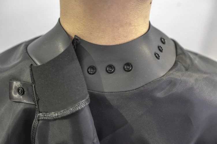 The seal prevents hair or water going down the neck. Made of a durable, lightweight, water-resistant fabric, the Neocape is extremely comfortable to wear and replaces a standard hairdressing gown.